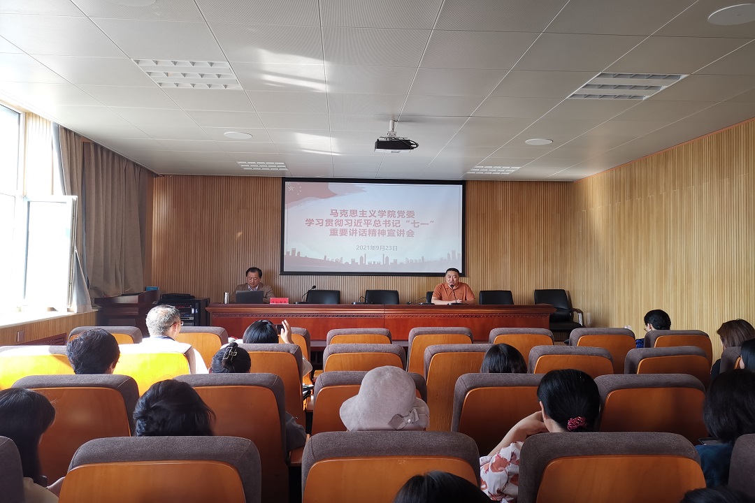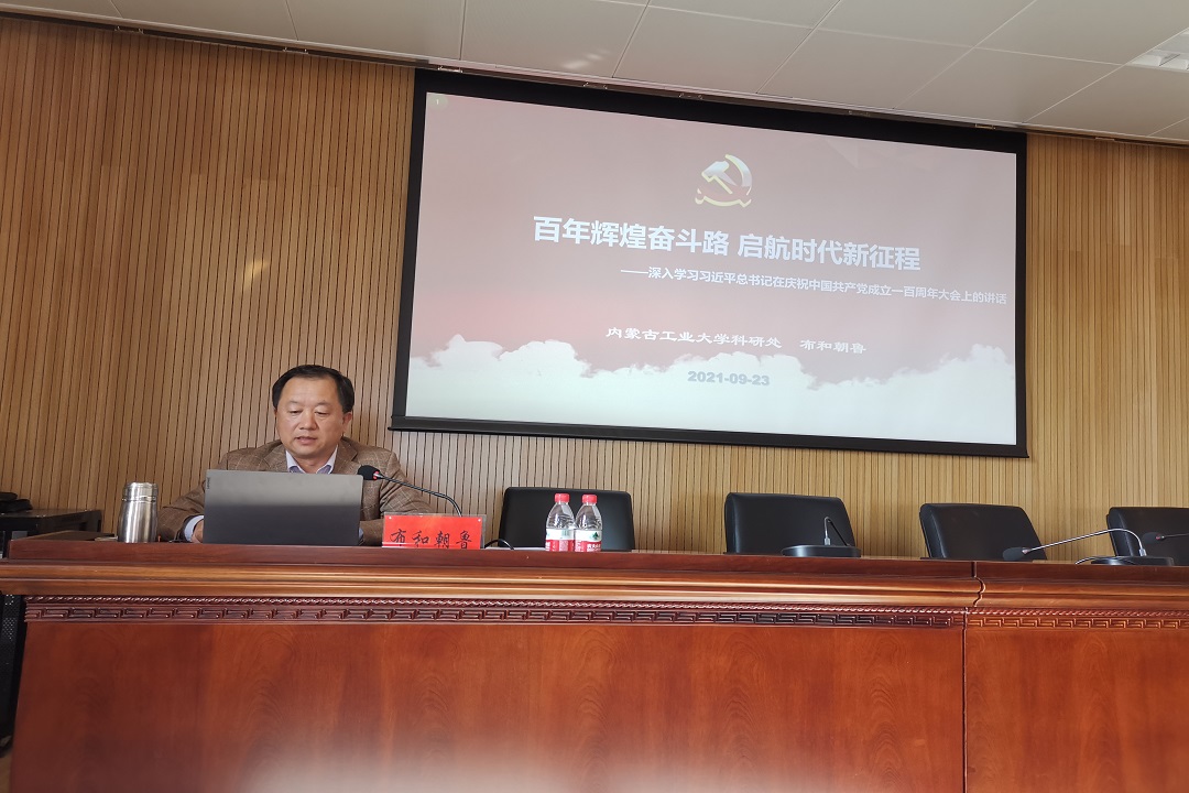 为深入学习贯彻习近平总书记在中国共产党成立100周年庆祝大会上的重要讲话精神,全面推进党史学习教育走深走实,按照学校党委的安排和部署,9月23日下午,威尼斯WNS9778党委召开学习贯彻习近平总书记“七一”重要讲话精神宣讲会。本次宣讲会由学校党委宣讲团成员、科研处副处长布和朝鲁教授进行宣讲。学院党委书记王文华主持宣讲会。