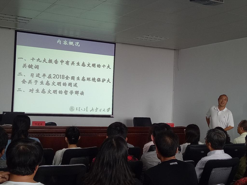 李笑春教授主要从党的十九大报告中有关生态文明的提法、对生态文明的哲学解读两个方面进行了讲解。通过深入浅出、幽默风趣的语言,使师生们进一步认识到,生态文明建设是千年大计,要树立正确的社会主义生态文明观,倡导绿色生产和消费,反对奢侈浪费和不合理消费,打赢蓝天保卫战;通过哲学角度对生态文明的解读,打开了师生们理解生态文明的全新视野,使师生们深刻认识到,生态文明是中国发展理念与发展道路的必然选择,要认识自然、效法自然,在生态建设与环境保护中遵循自然法则,以环境与资源承载力引导发展,建立可持续发展的“生态安全观”,使全人类都承担起整个人类全球王国时代的生态责任,建设美丽家园。