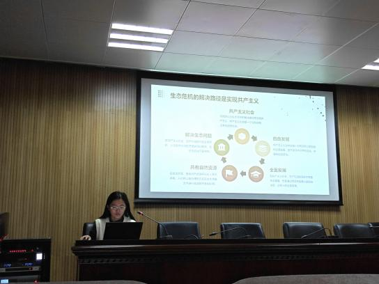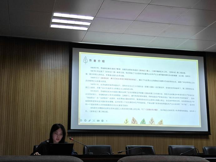 陈昱名同学带领大家走进《法德农民问题》,深入探讨了农民与人口、生产和政治力量的关系。她通过详实的分析和精彩的阐述,揭示了维护农民利益必须妥善解决好土地问题和农业发展问题的重要意义。
