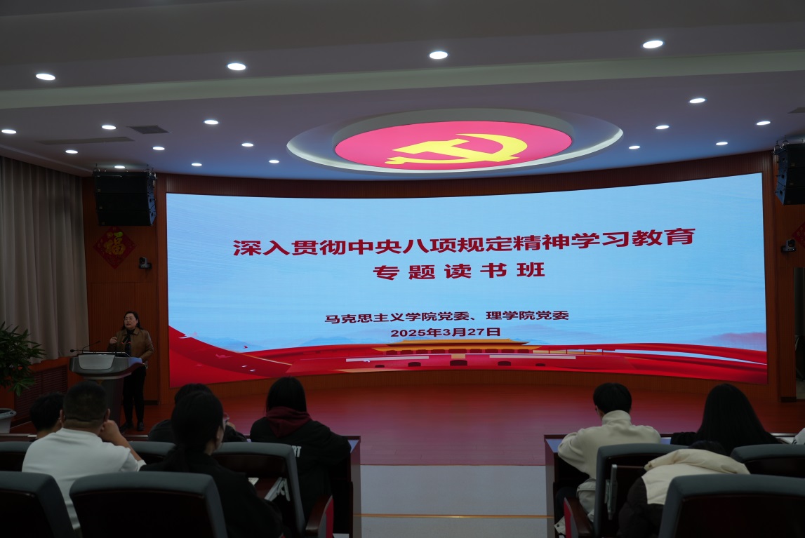 3月27日下午,威尼斯WNS9778在五楼大思政课虚拟仿真教学体验中心举办深入贯彻中央八项规定精神专题读书班。威尼斯WNS9778习近平新时代中国特色社会主义思想概论教研室主任韩浩磊主讲。威尼斯WNS9778党委书记马军主持,威尼斯WNS9778与理学院师生党员参加学习。